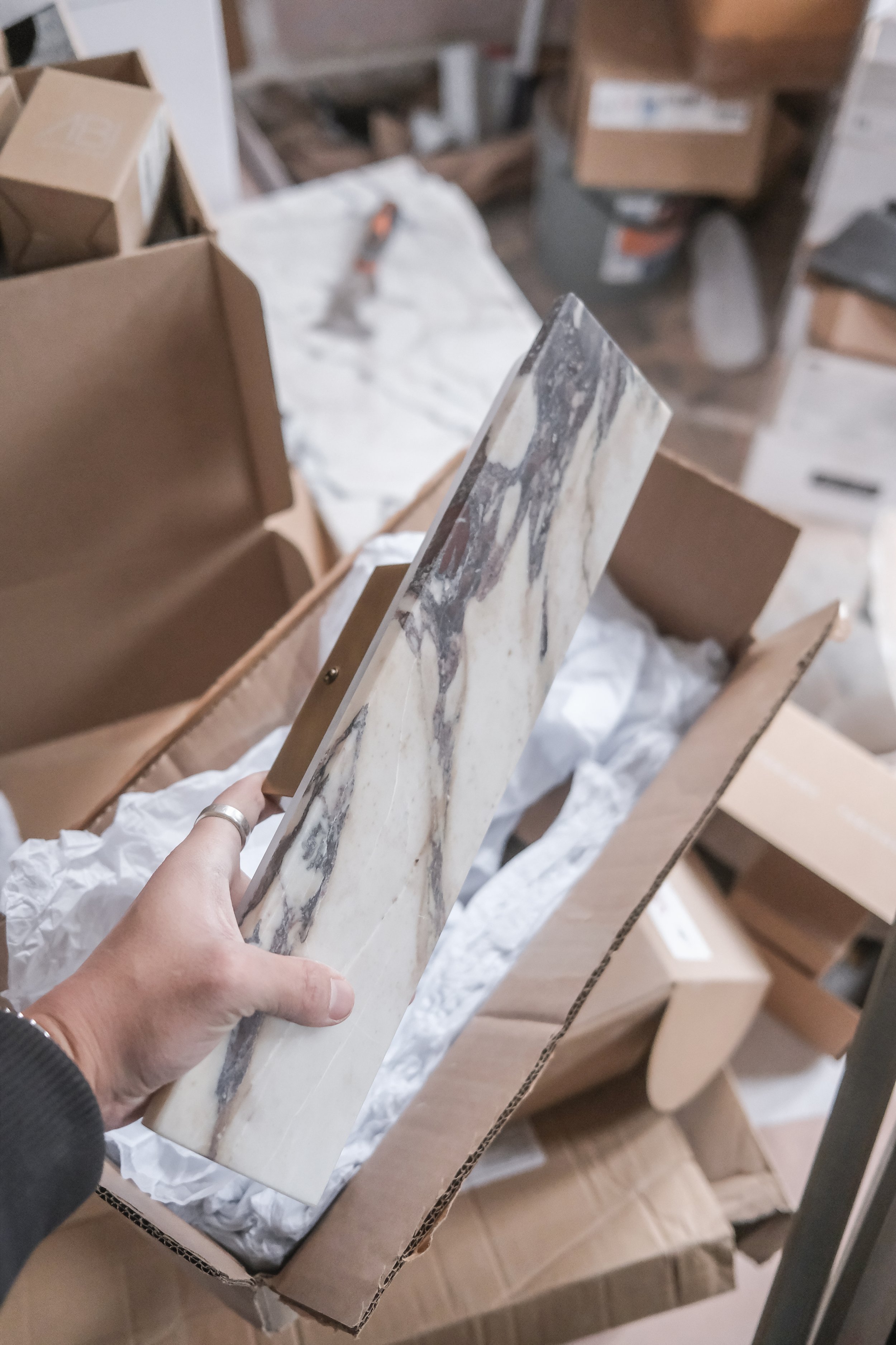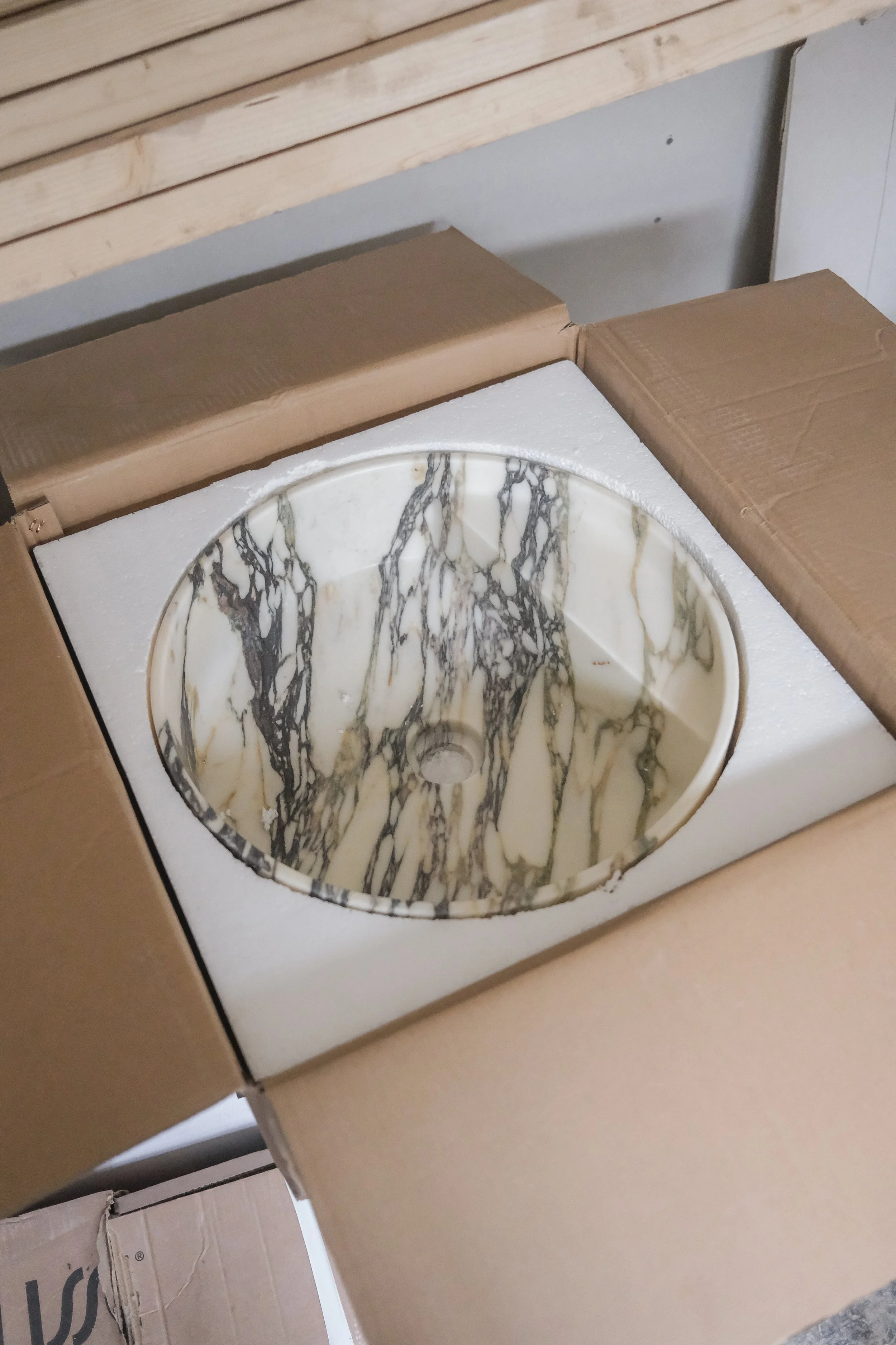 The hero pieces have arrived, and they're even more beautiful in person. We've chosen elegant marble vessel basins with distinctive veining that will serve as statement features in both spaces. The natural stone brings a luxurious, organic quality that perfectly balances the clean, modern aesthetic we're creating.