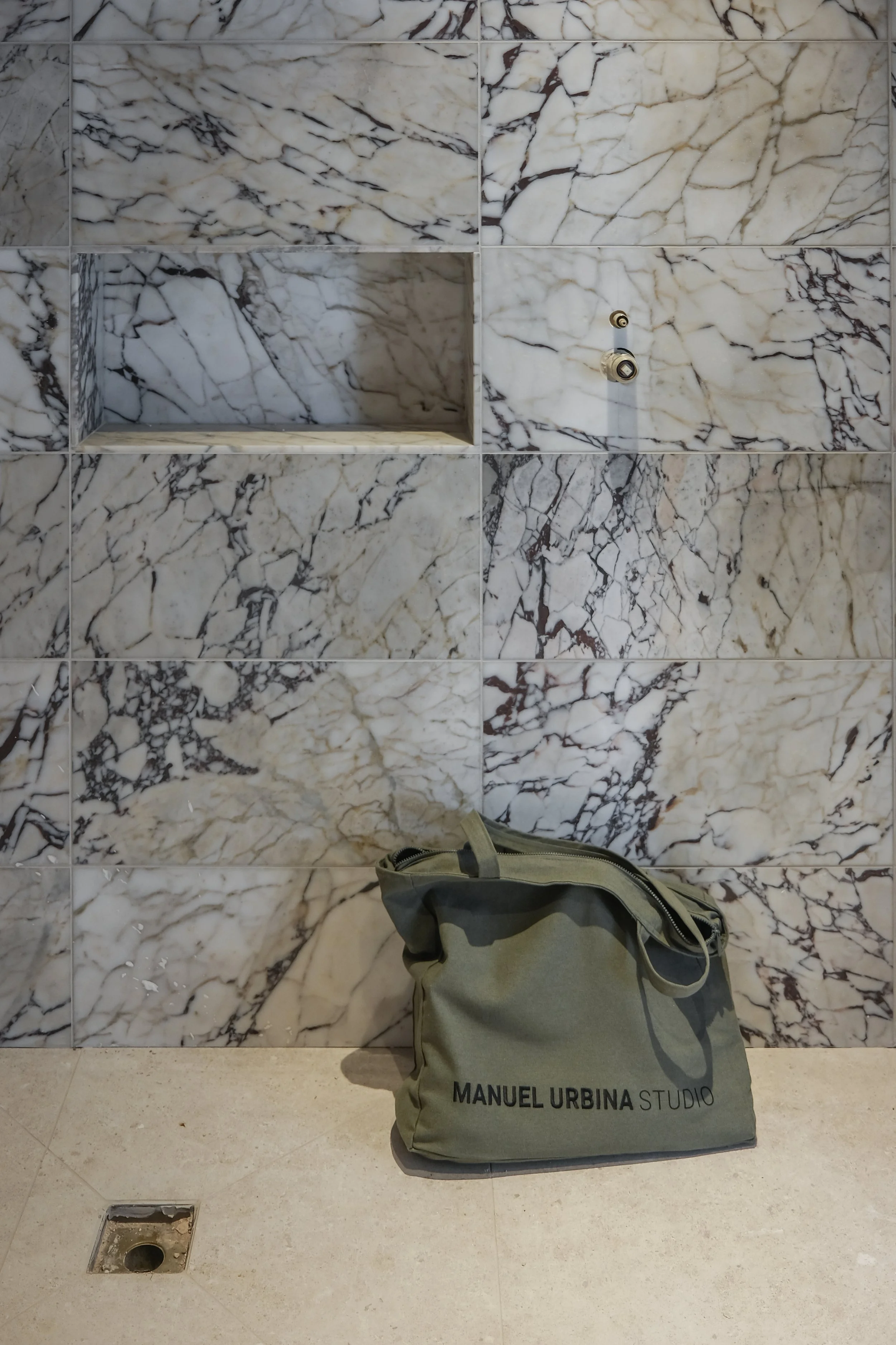 The new bathroom showcases a mix palette of materials such as featured marble wall, microcement throughout walls and ceilings, large format tiled floor, brushed brass finishes and a statement freestanding bath.
