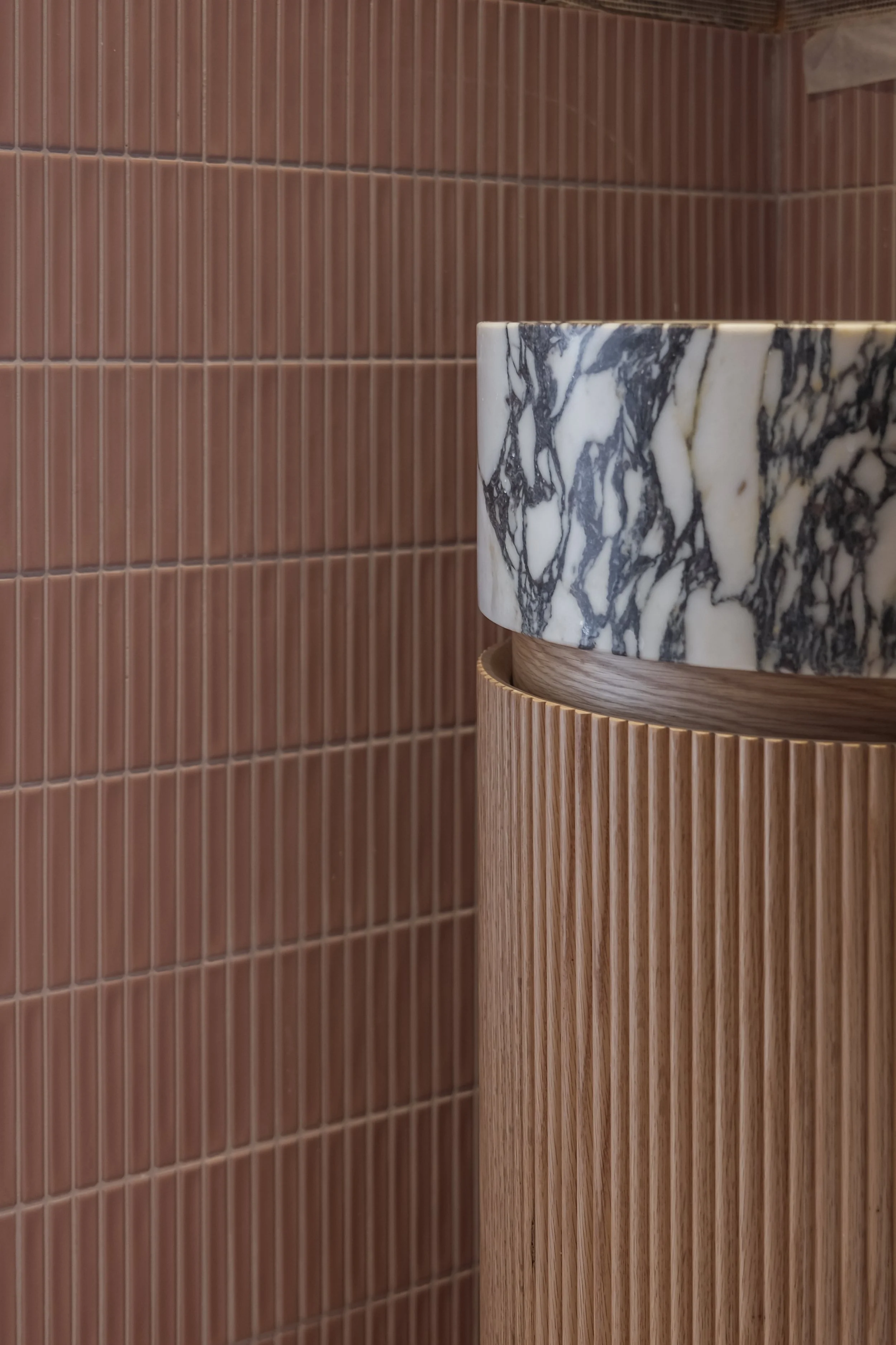 The ensuite has a playful chic palette of materials such as featured marble niche and vanity, nude microcement throughout walls and ceilings, terrazzo tiled floor, and brushed brass finishes.